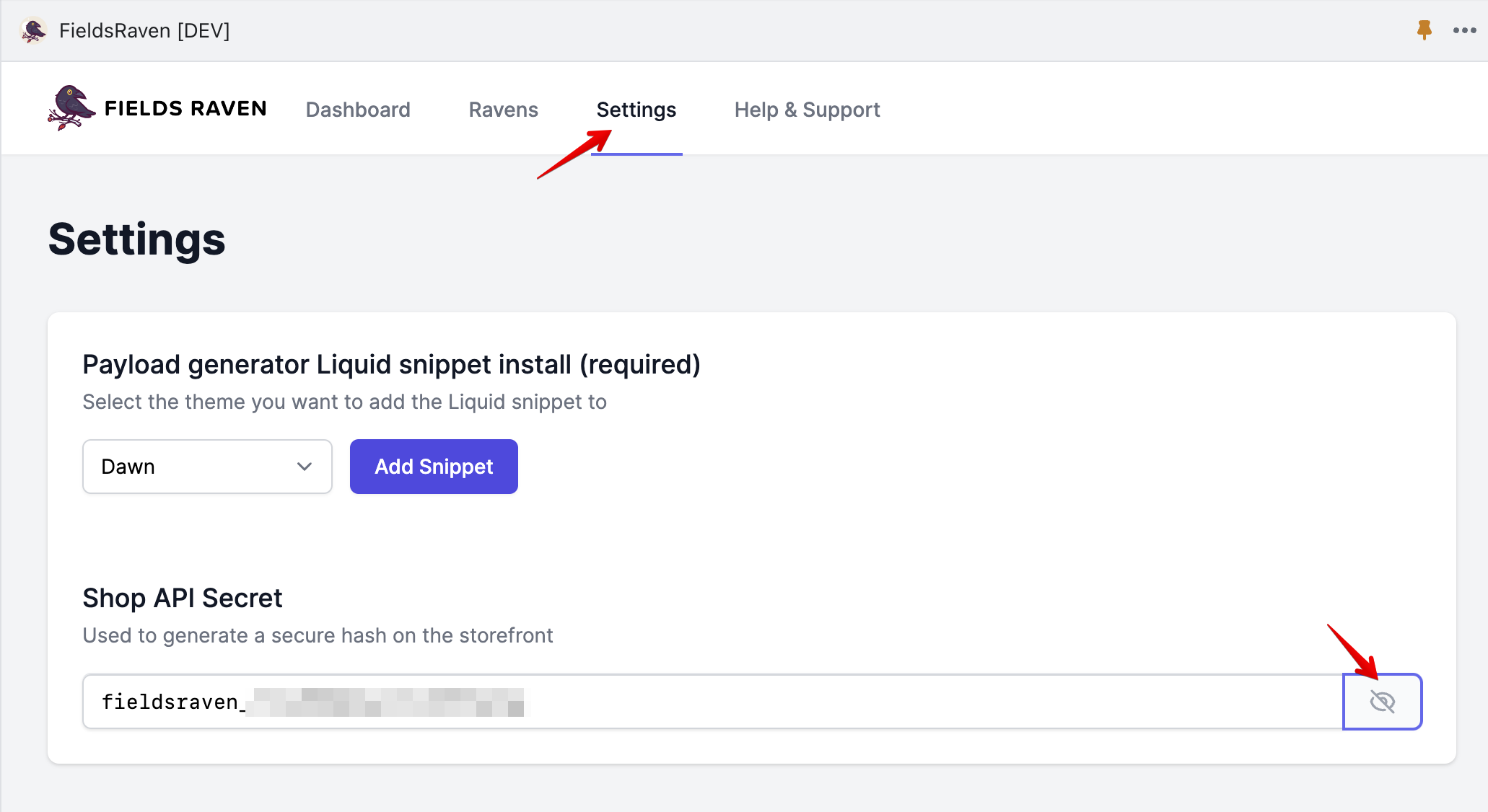To make sure your Shopify store has the secret key go to settings and click on the eye icon, if the secret key is missing please [reach out](mailto:karim@fieldsraven.app).